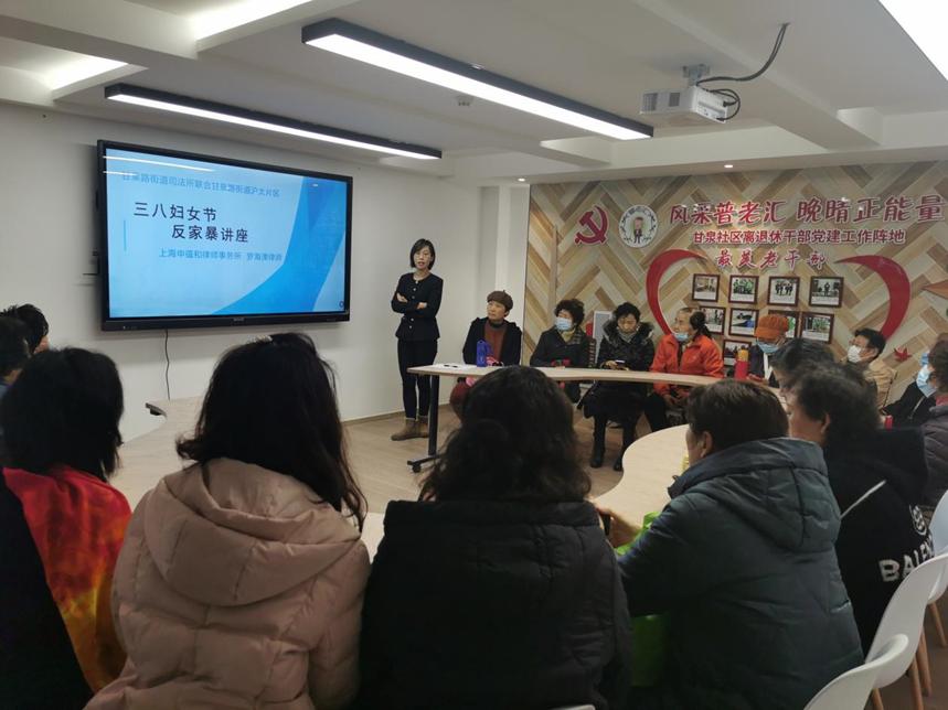 上海申蕴和律师事务所多年关注居民调解、法律咨询、女性自我保护等公益活动,呼吁居民以合理的方式处理纠纷,注意保护自身的合法权益。图为罗海溧律师为女性群体进行反家暴讲座。虹口区