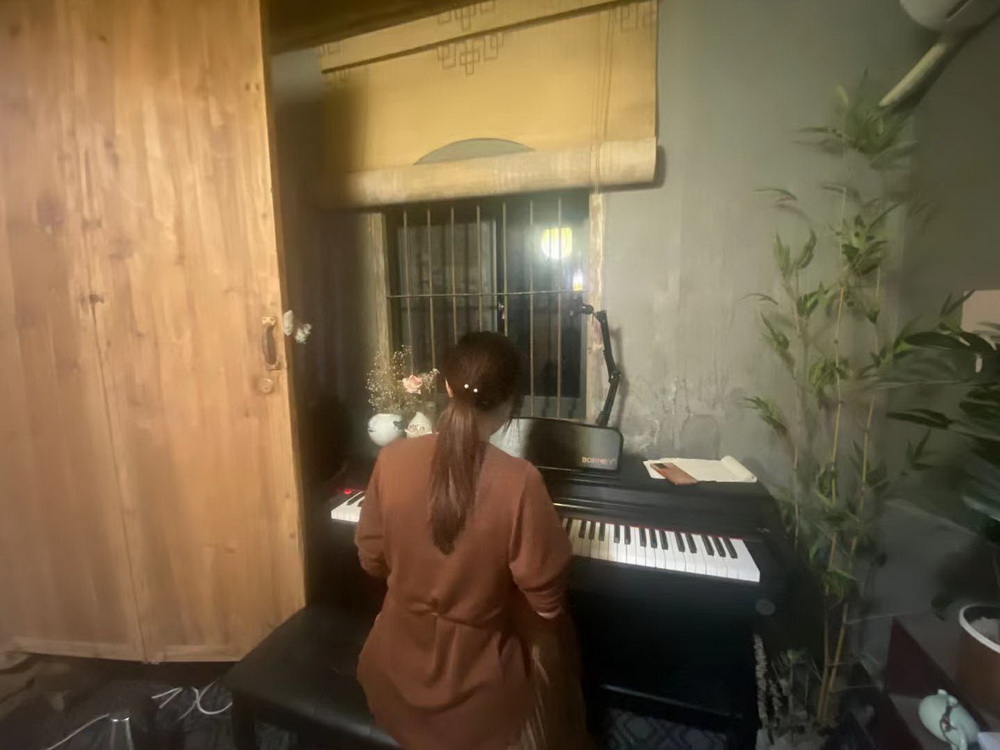 易梦寻在自己改造的房间里弹电子钢琴。受访者提供