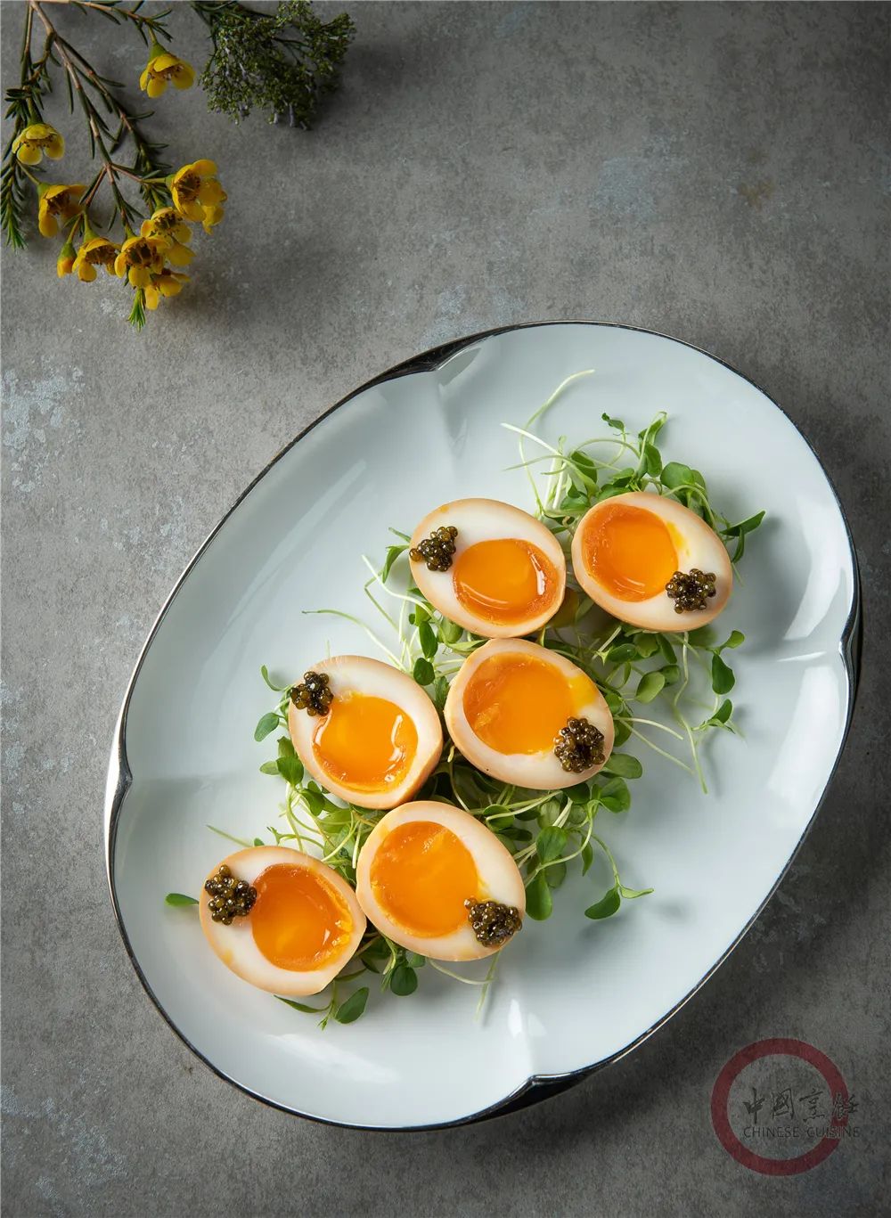 将鸡蛋入凉水中煮6分钟,捞出放冰水中冰镇,剥壳后放秘制卤汁中浸泡4小时至入味,一切为二,放入垫有香椿苗的盘中,点缀鲟鱼子酱即可。