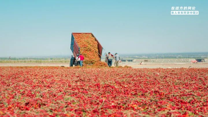 从每年的9月开始,安集海的辣椒就进入了采摘的季节,这里的辣椒种植户就会雇佣工人到农田采摘辣椒,然后用拖拉机运到这个晒场上晒干水分。这每一块儿红色的地毯,就代表着一家人的辣椒。