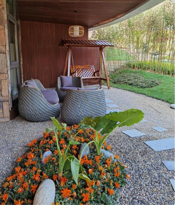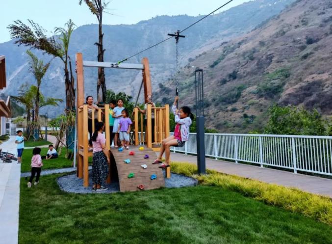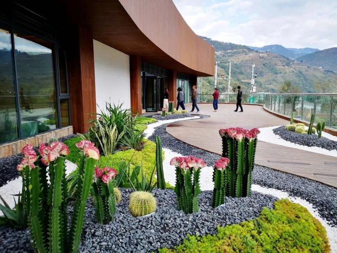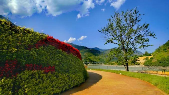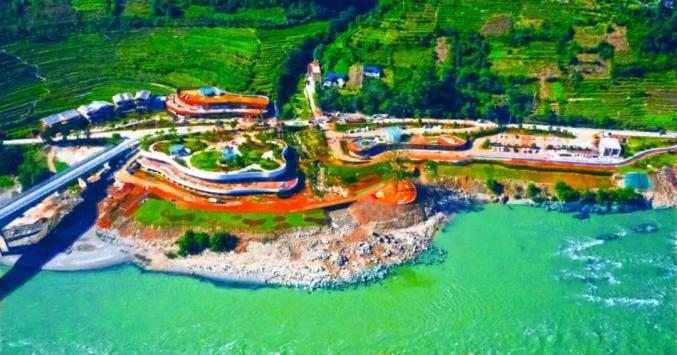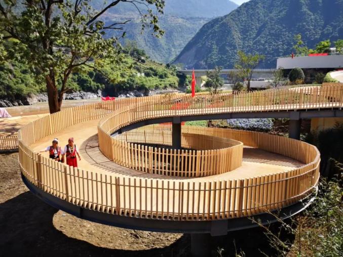 怒江美丽公路小沙坝服务区位于泸水市以北,距离泸水市区4.3公里,是游客进入怒江大峡谷的第一站。服务区遵循“负建筑”生态环保理念,采用覆土式建筑结构,将建筑轻轻镶嵌于地形之中,整个设计与周边环境浑然一体,像从土地中自然“生长出来”,上可平接美丽公路,下可直达江畔景观,形成优美的屋顶花园和滨江步道,成为怒江大峡谷中的一个新的靓丽景区。