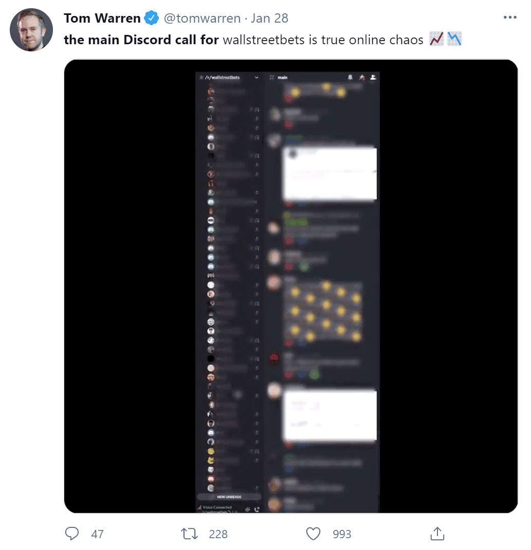像是年初很火的空头做空 GameStop 被散户冲爆的那个事儿,这些散户就是通过 Discord 上专门的讨论组来进行交流的,这个群组在很短的时间内聚集了数千人。