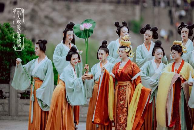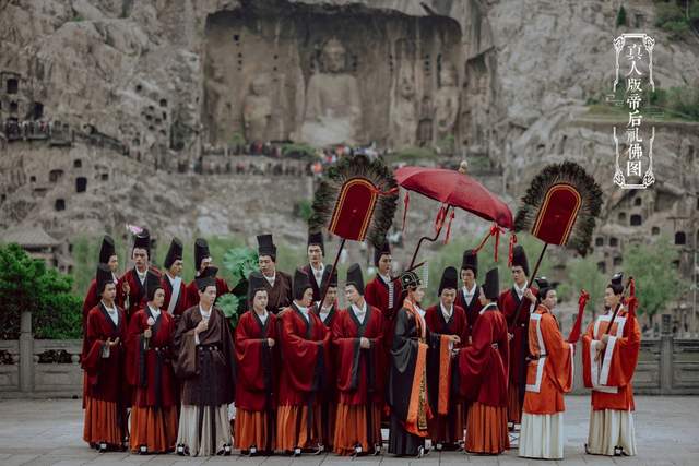 在洛阳龙门石窟景区的礼佛台上,肃穆威仪的“北魏孝文帝”与端庄华贵的“文昭皇后”在侍从的随侍下徐徐而来,拈香礼佛,华丽的服饰、生动的形态,真人演绎让游客梦仿佛穿越回1500年前的北魏,生动再现了龙门石窟宾阳中洞内《帝后礼佛图》浮雕上的盛景。