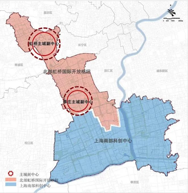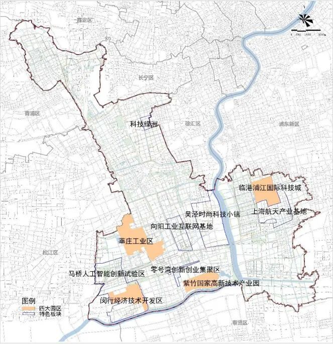北部虹桥国际开放枢纽:北部打造虹桥国际开放枢纽,包括莘庄镇、七宝镇、梅陇镇、虹桥镇、华漕镇、新虹街道、古美路街道。落实好长三角一体化发展国家战略,聚焦虹桥商务区,带动漕河泾虹桥科技绿洲、九星、吴中路、七宝、南方、莘庄等商务区全面发展,打造国际商贸、现代金融、文化创意、科技服务、新一代信息技术、生物医药等产业集群,全面推进国际化中央商务区、国际贸易中心新平台建设,打造引领长三角地区更高质量一体化发展的国际开放枢纽。