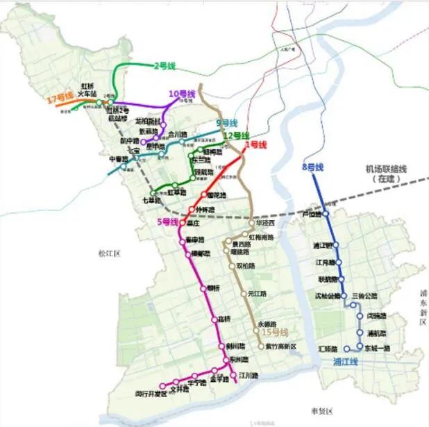 现状轨道交通分布情况示意图加速推进轨道交通建设。结合全市新一轮轨道交通建设规划,加快推进机场联络线、嘉闵线、19号线、23号线、13号线西延伸的建设。大力提升轨交站点600米半径覆盖率,至“十四五”期末由现状的15%提升至 25%(项目及数据来源:《闵行区综合交通“十四五”规划》)。