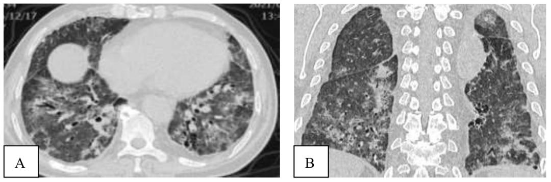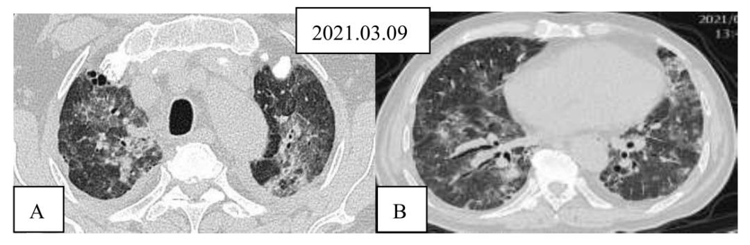 图1激素治疗前胸部CT平扫图A(矢状位)及B(冠状位)示双肺弥漫性磨玻璃影,双下肺可见牵拉性支气管扩张。诊疗经过