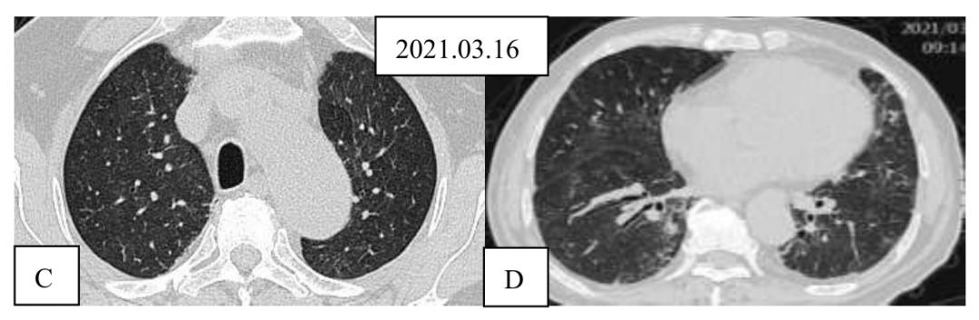 图2肺组织标本病理图HE(A)染色示肺泡间隔增宽,免疫组化染色示间质淋巴细胞浸润(B),肺泡内吞噬细胞聚集(C)。4.转归:3月16日(激素治疗7天后)复查胸部CT两肺间质性炎症,两肺下叶局部支气管扩张。病灶较前明显吸收。