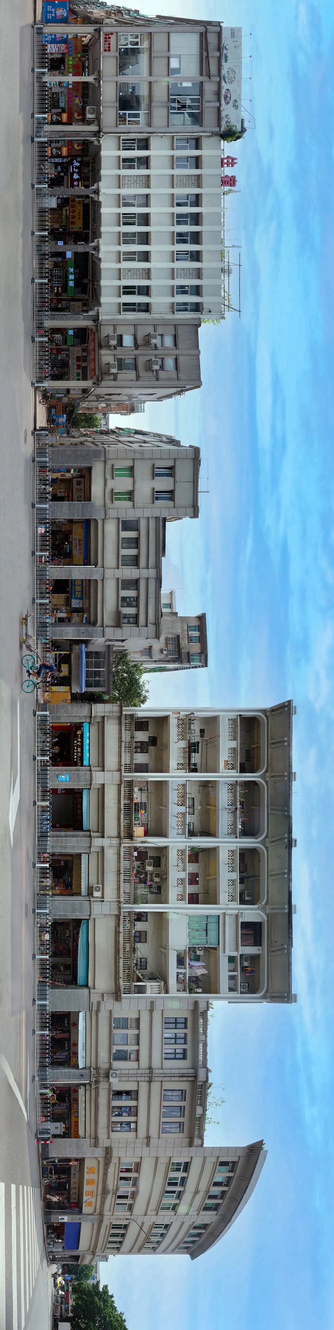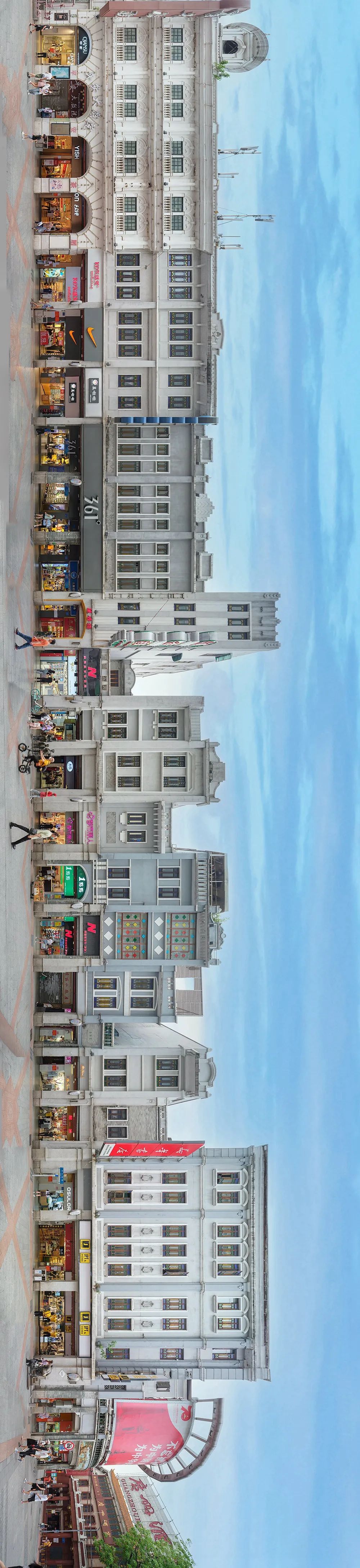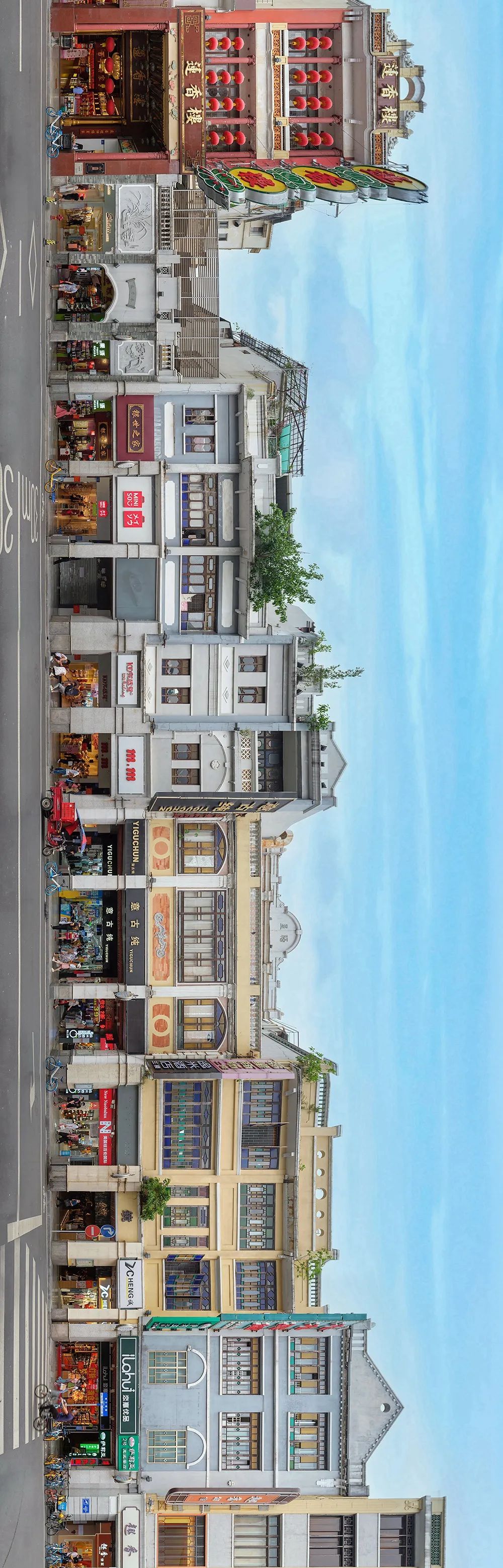 典型骑楼街是连续的 全景图为恩宁路西段北侧 全长450米(2020)极:对这种长卷图的滑动观看方式是碎片化的,而此类图片最佳的观看方式应该是全景式的整体展示,对此你怎么看?