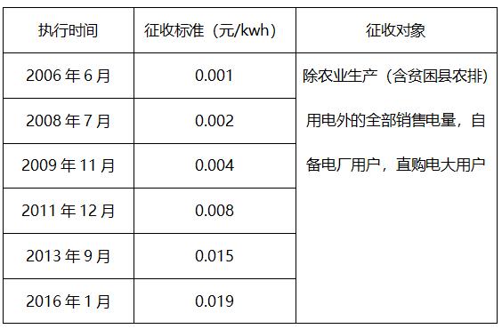 <可再生能源发展基金征收管理暂行办法>的通知》(财综〔2011〕115号),办法明确可再生能源电价附加自2012年1月1日起实施征收。全国可再生能源电价附加理论收入采用如下公式计算:可再生能源发展基金征收管理暂行办法>某年可再生能源电价附加理论收入=(全国用电量-农业用电量-西藏自治区用电量)*电价附加标准。其中电价附加标准历年来有所变化,其变化数值如下表1所示: