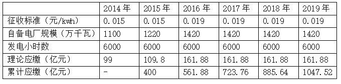 根据能源局公布的数据,截至17年底,全国企业自备电厂装机容量超过1.42 亿千瓦,15 年为1.22 亿千瓦,占全国电力总装机的8.6%。其中,自备燃煤机组装机容量1.15 亿千瓦,占全部自备机组装机总容量的81%。国家发改委对自备电厂的整治公告显示:“十二五”期间自备电厂拖欠可再生能源电价附加约为400亿元。据此我们测算,从2010年至2019 年自备电厂累计应缴附加费约为1047.52 亿元。由此可见,自备电厂的欠缴费用的确是补贴缺口的重要诱因。