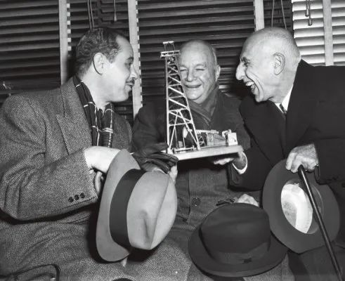 (1951年11月,伊朗首相摩萨台(右)访美期间,华盛顿律师、前美国驻伊朗大使华莱士·摩菲赠给他一个油田小模型。此时,伊朗刚刚将英伊石油公司国有化,美国正从中调解伊朗与英国的石油纠纷)