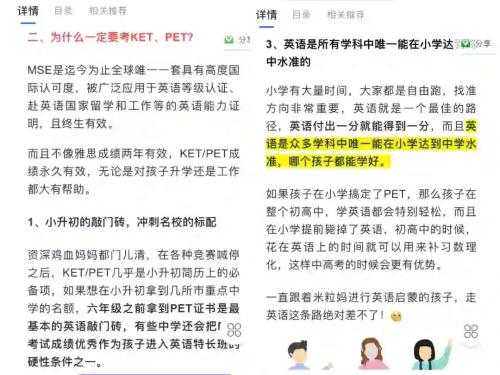 在课程详情中,KET和PET考试却被称作“小升初的敲门砖,冲刺名校的标配”,甚至提到,“英语是众多学科中唯一能在小学达到中学水准,哪个孩子都能学好”,直指“超前教育”。列表显示,有2409人花费349元开通了KET课程;PET课程售价399元,已有795人开通。