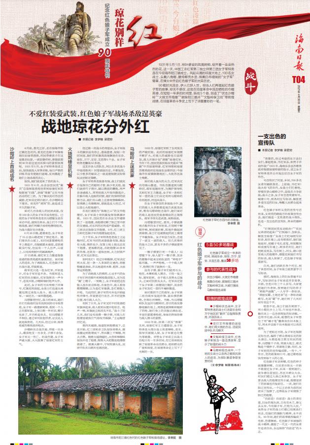 1931年5月1日, 中国工农红军第二独立师第三团女子军特务连在今琼海市阳江镇成立。在红色娘子军成立90周年之际,海南日报4月30日推出《纪念红色娘子军成立90周年特刊——琼花别样红》。