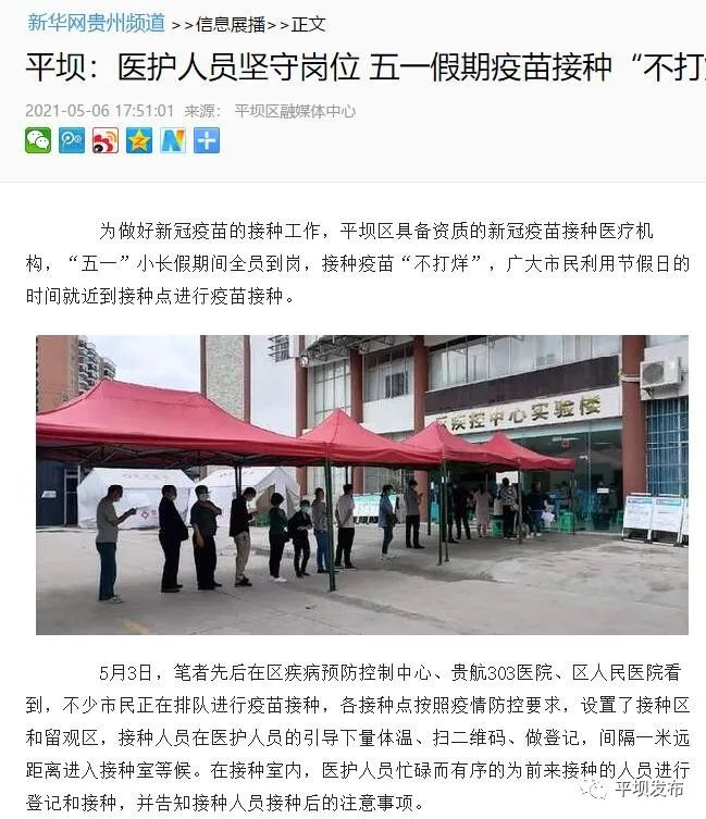 ● 新华网贵州频道 2021-05-06报道平坝:医护人员坚守岗位 五一假期疫苗接种“不打烊”