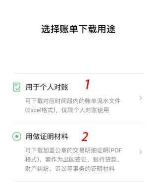 第五步:在账单下载界面,有“用于个人对账”和“用作证明材料”两个功能选项,分别对应账单不同的用途。其中“用于个人对账”的账单是Excel表格格式,“用做证明材料”的账单是PDF格式。