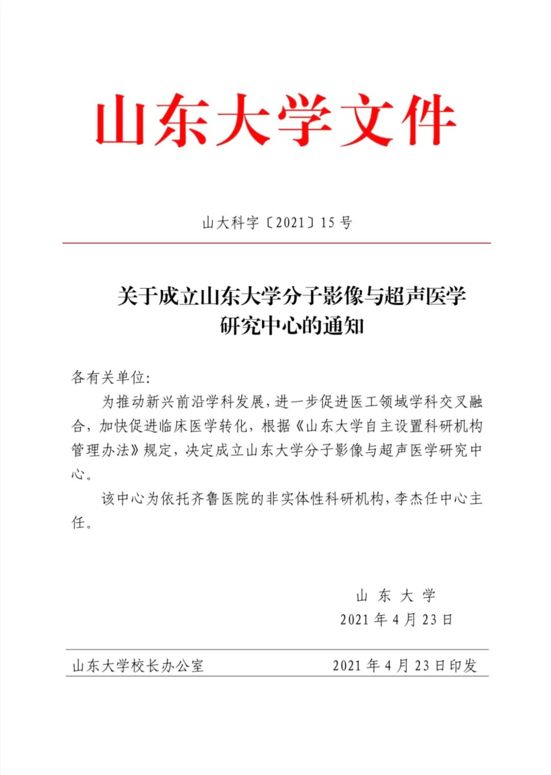 近日,山东大学分子影像与超声医学研究中心获得山东大学批准成立,山东大学齐鲁医院(青岛)党委副书记、纪委书记,超声科主任,齐鲁医院超声医学学术带头人李杰教授任中心主任,中心主要研究人员包括齐鲁医院放射科于德新教授、核医学科李昕教授,山东大学化学与化工学院鲁在君教授、微生物技术研究院宋淳教授等。