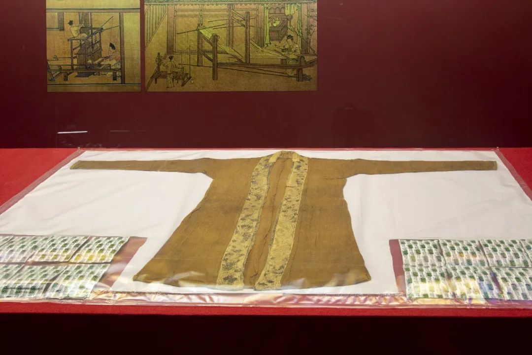 宋元时期,福州成为全国丝绸纺织中心,也是对外贸易中丝绸的主产地之一。这件烟色镶金边绉纱窄袖上衣为古时贵妇人穿上正装后罩在外面的纱衣,极轻薄,表面自然绉缩而显得凹凸不平。