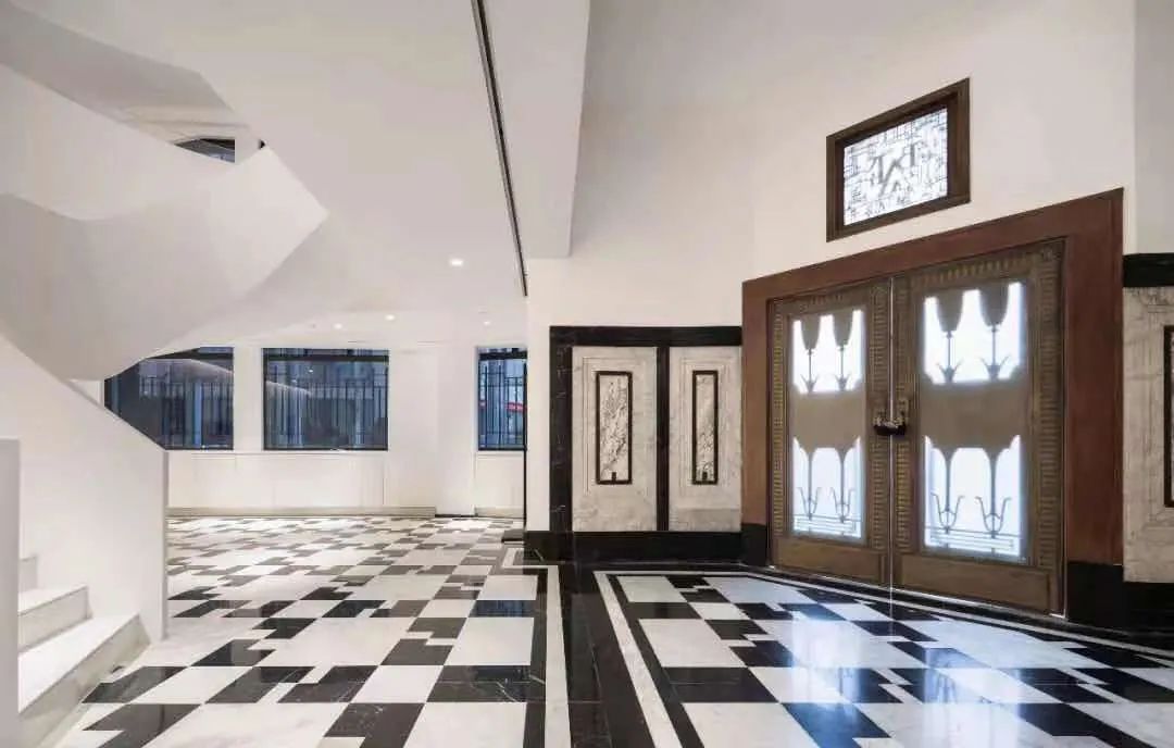 4、一层大厅变主题展览馆修缮工程将大楼原封闭的一层和夹层转换为向公众开放的沪港银行历史展览馆,大厅内完整保存了黑白大理石拼花的银行柜台、墙面护壁,墙面、天花的装饰线脚突出线条感,配合抽象几何的图形,室内空间同样完整全面地体现了装饰艺术派风格。