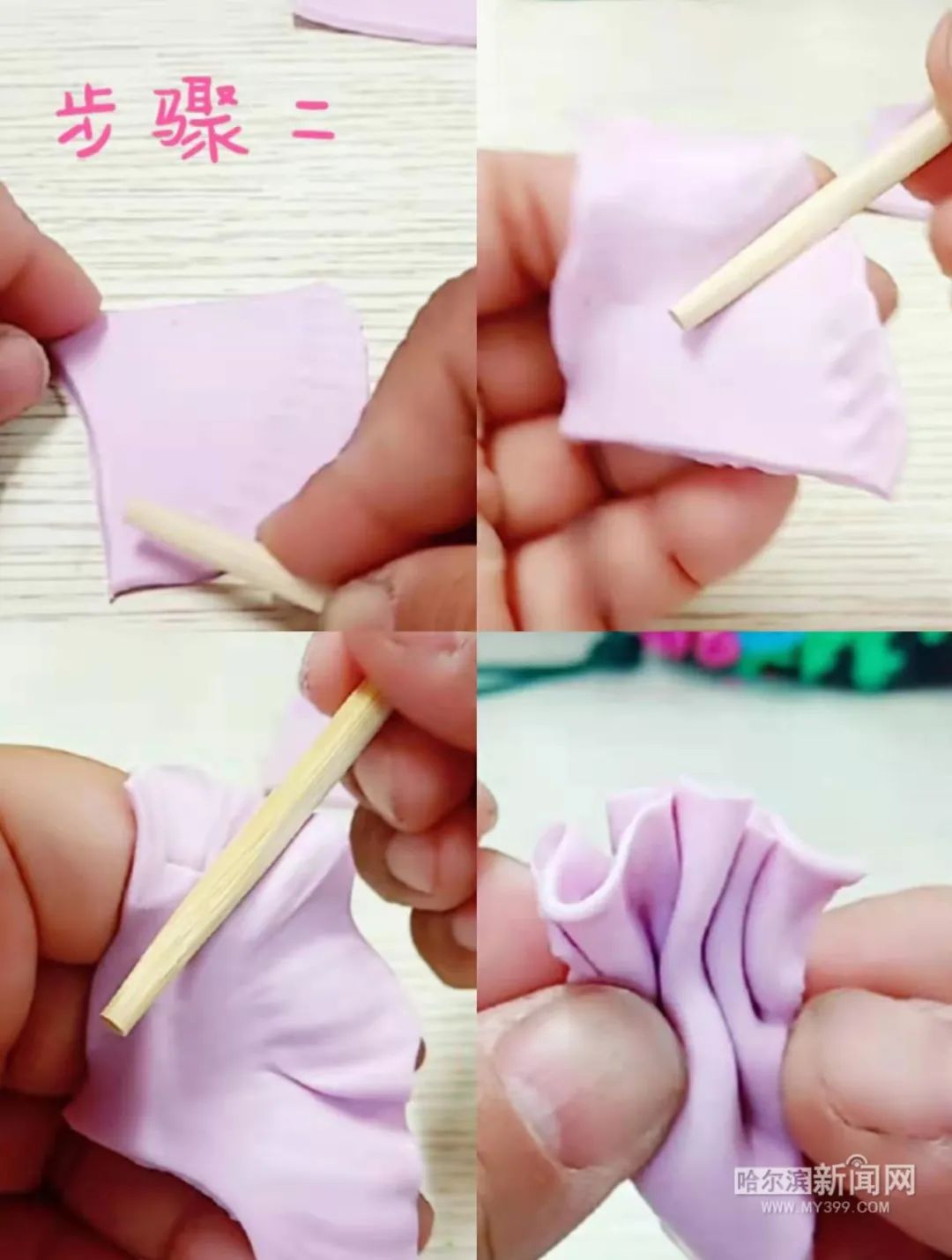 取其中一份,用筷子在弧形边缘按压变薄,再用筷子反复在边缘滚动擀压,使弧形边缘更为自然,将弧形的边缘一反一正捏制成花瓣。
