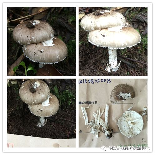 假褐云斑鹅膏菌:形似“青鸡枞”,长10~15cm;菌盖乌黑色,顶部较深;直径10cm,左右;菌褶、菌柄呈白色,有菌环和菌托,6-8月是生长季节,芒市、盈江县有分布。