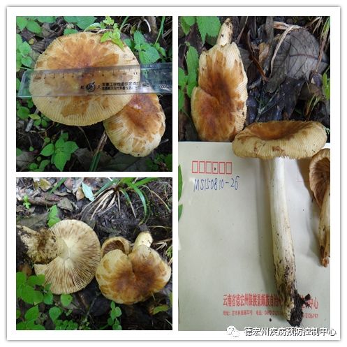 3、点柄臭红菇:菌盖较大(搭着直径约13cm),成棕黄色;菌褶呈黄白色;菌柄粗大,呈黄白色,空心。一般生长于海拔在1200米以上的阔叶林下,6~8月生长,也常被误食。