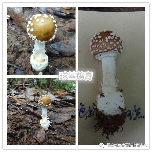(3)球基鹅膏:生长于栎树林中;菌盖棕色,上有白色蔟状凸起;菌褶白色;菌柄白色不光滑,附有粉状颗粒;有白色菌环;基部膨大有菌托。发现地:芒市五岔路乡。