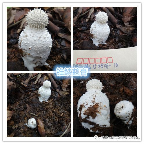 (4)锥鳞鹅膏:生长于栎树林中;全菌纯白色,无明显的菌盖、菌柄、基部;全菌呈球状,有白色锥形鳞状凸起,顶部较密集和细长。发现地,遮放坝子东南侧的山脚下。