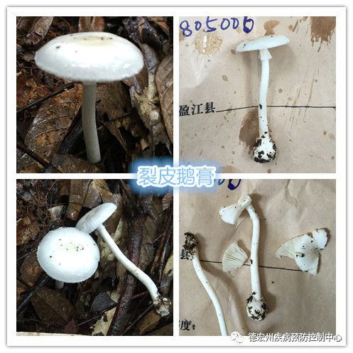 (5)裂皮鹅膏:菌盖白色光滑;卷子白色束状;菌柄细长,有灰色鳞状纹;有白色菌环和菌托。发现地:盈江县。