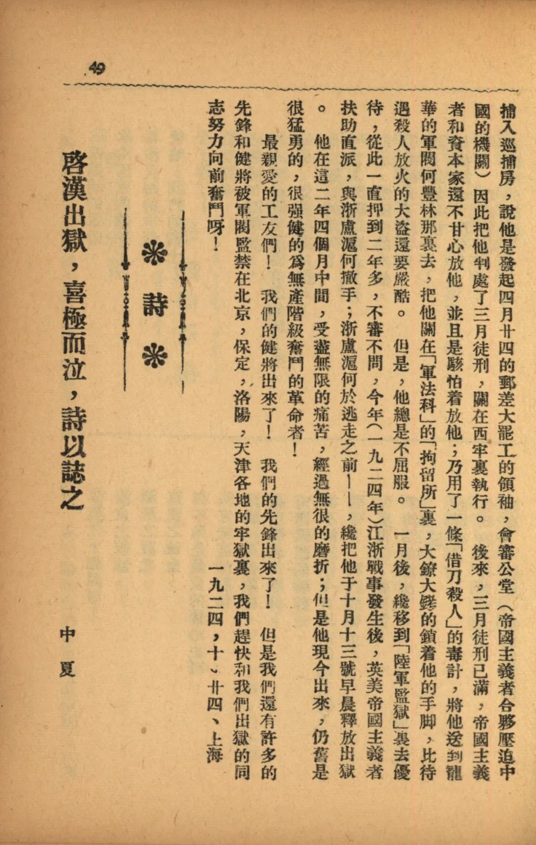 ▲1924年第二期《中国工人》发表了发表了邓中夏写在李启汉出狱当天的一首诗——《启汉出狱,喜极而泣,诗以志之》九