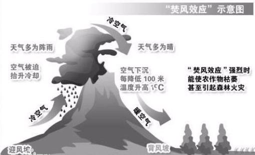 焚风效应:过山气流在背风坡下沉时,温度升高湿度降低,形成一种干热风。