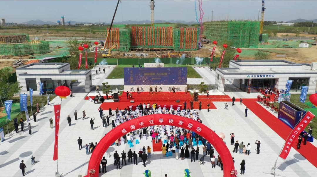 5月9日,威海天立学校主体封顶暨家校服务中心落成仪式在南海新区举行。天立学校是神州天立教育集团在南海新区打造的集小学、初中和高中于一体的高起点、高规格、高品位的寄宿制品牌旗舰学校。从2月23日开工到5月9日封顶,短短75天的时间,天立学校项目一期主体完成封顶,教学楼、国学堂等建筑拔地而起。