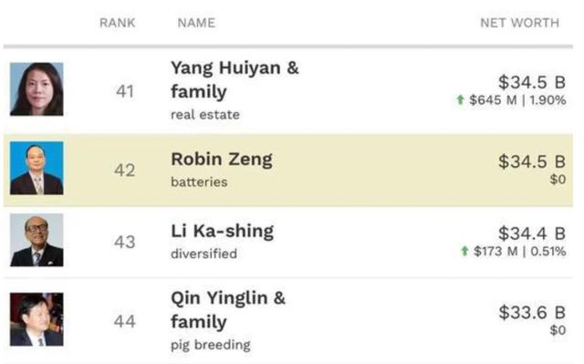 ▲宁德时代曾毓群此前,在今年4月发布的2021福布斯富豪排行榜上,曾毓群则是以284亿美元位列《2021福布斯全球富豪榜》第42名。
