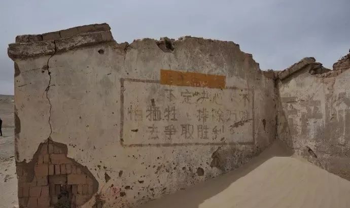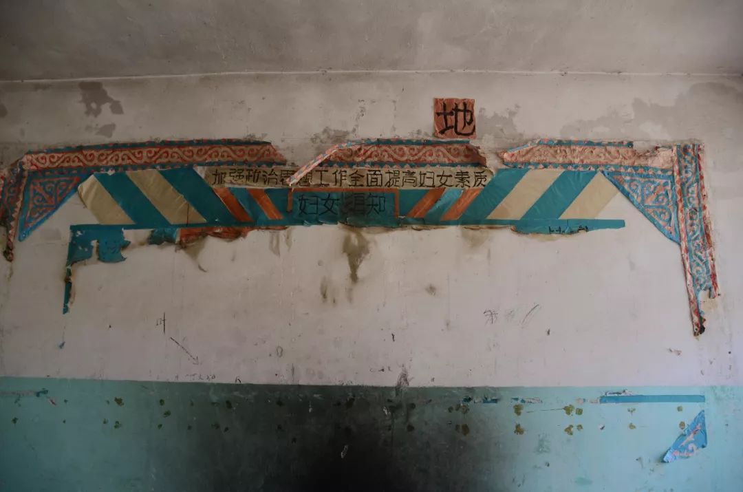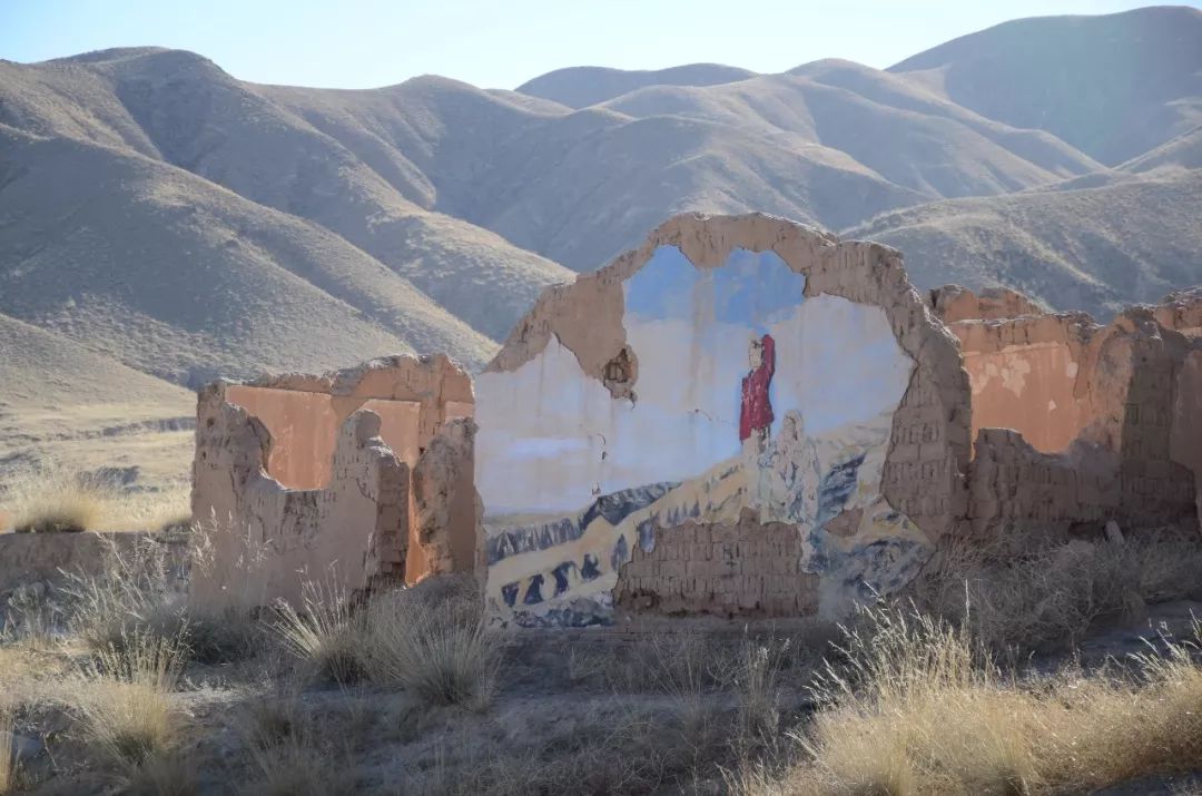 挺立的砖石建筑东倒西歪,土著的房舍土崩瓦解,窗上的玻璃支离破碎。是啊,确是一片废墟的样子。但满目的断壁残垣里,印在白墙上的毛主席语录依稀可见,画在墙上的壁画色彩依然明亮,墙角的狗尾巴草悠然晒着太阳打着盹......