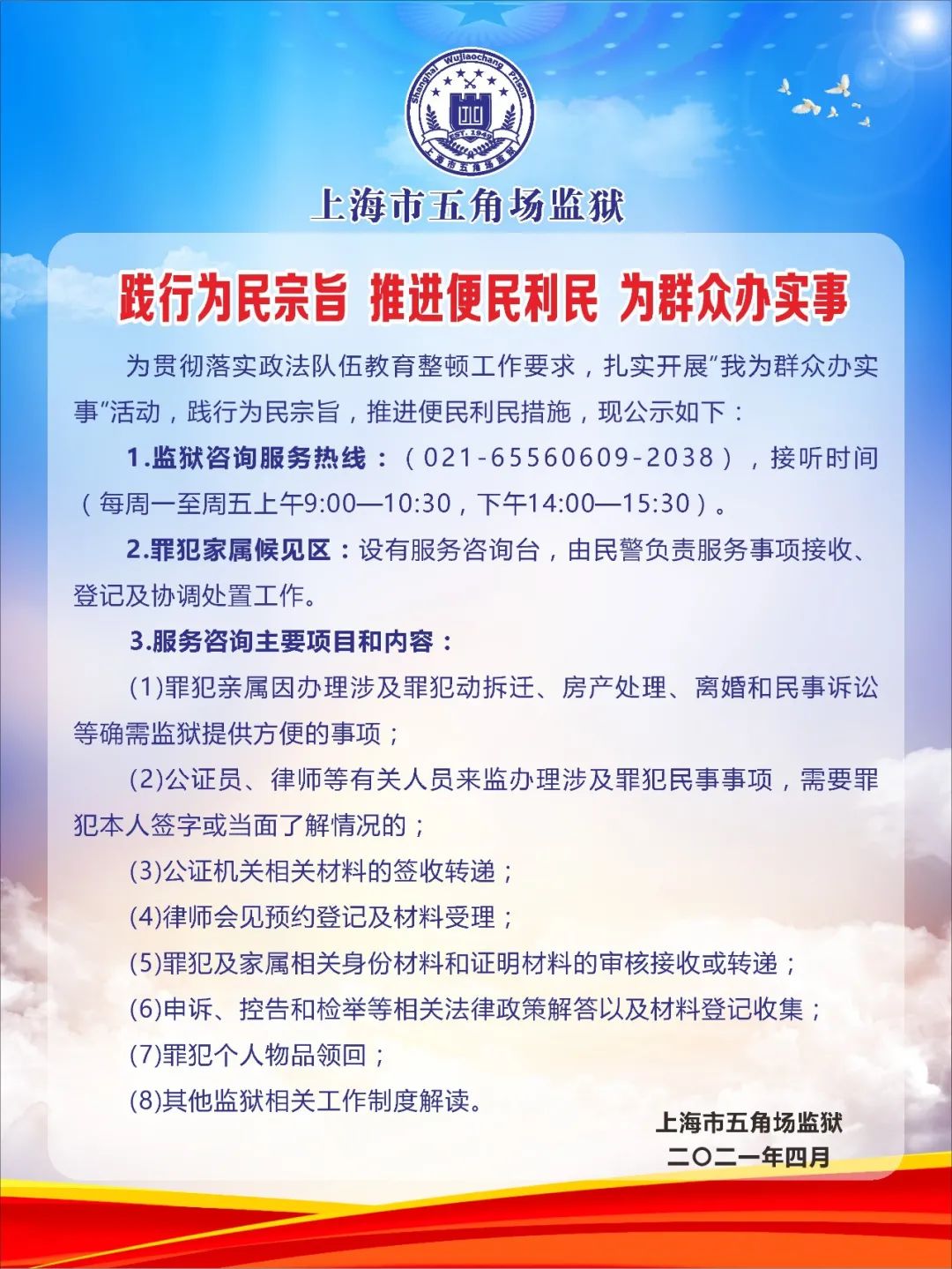 2深化监狱咨询平台建设,公示服务时间,指定专人接听,妥善应对各类咨询需求,并在会见日设立“咨询台”,明确监区领导、职能科室民警、监狱法制专员“三位一体”现场解答服务机制。