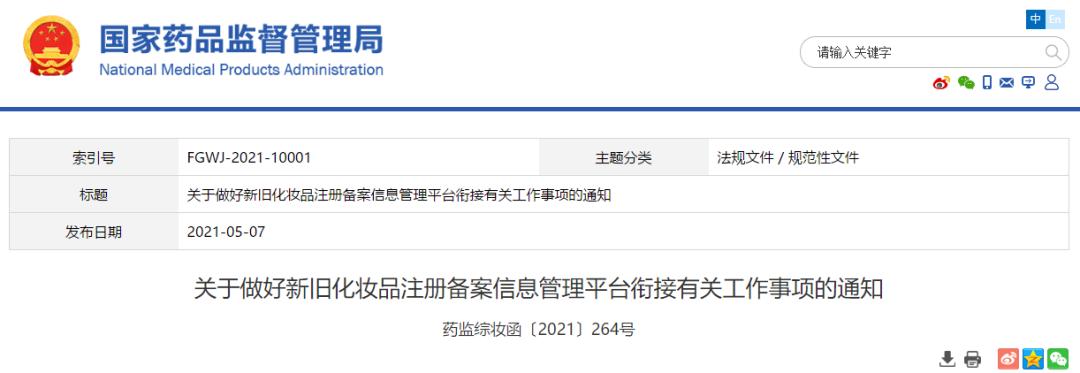 自2021年5月1日起,旧平台不再接收特殊化妆品注册申请和普通化妆品备案资料提交。