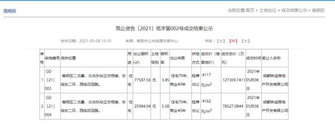 日前,贵阳市公共资源交易中心发布筑公资告〔2021〕低字第002号成交结果公示。位于南明区二戈寨的GD(21)003号、GD(21)004号宅地成功出让,被成都铁诚房地产开发有限公司以总价约20.59亿元竞得,总出让面积约10.36万平米。