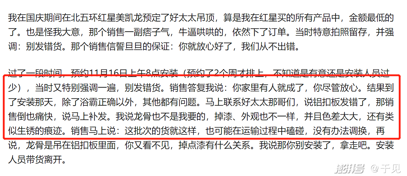 就比如红星美凯龙一直主打中高端销售口号,但售后服务却一直被大众所诟病,像安装和送货服务都是外包出去的,送货时效性很难得到保证,网上更是吐槽一片。