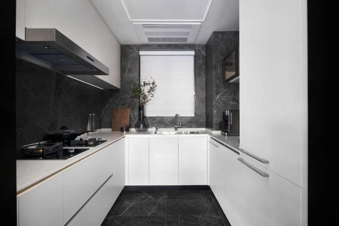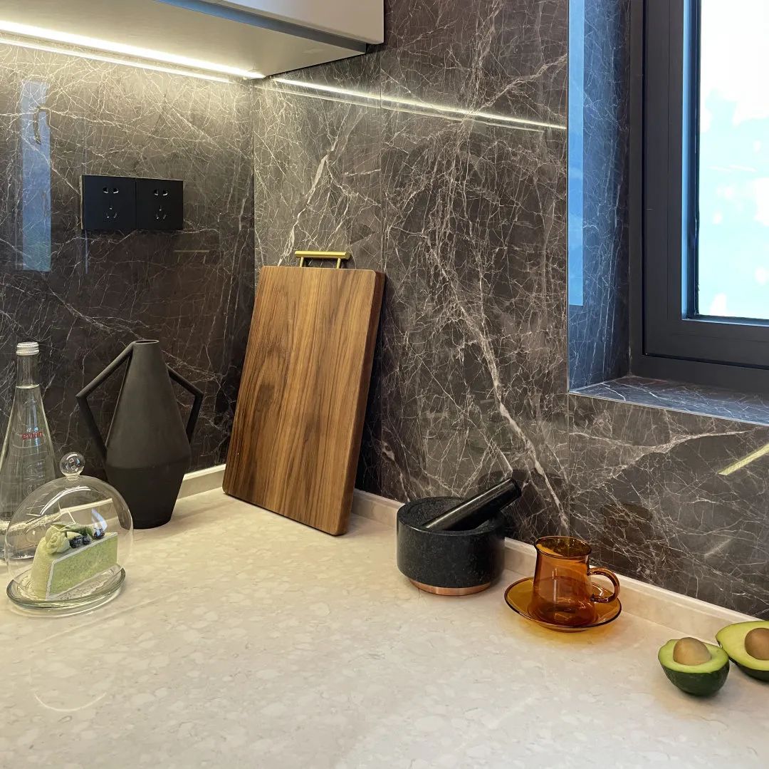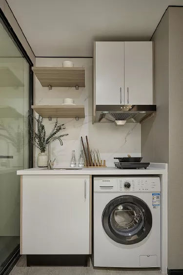 装配式厨房墙面采用节能环保的铝蜂窝复合瓷砖墙板,具有良好的防潮、防油污、阻燃特性,整体防水墙面、无湿作业。