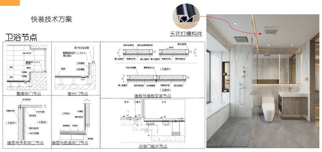 在住宅项目中,如何通过变革传统装修方式的装配式内装来实施的呢?以深圳半山臻境项目为实践,招商蛇口采用装配化内装产品体系,工业化生产的标准化内装部品,在现场采用干式工法组合安装,包括装配式卫浴、厨房、地坪、墙面、天花。