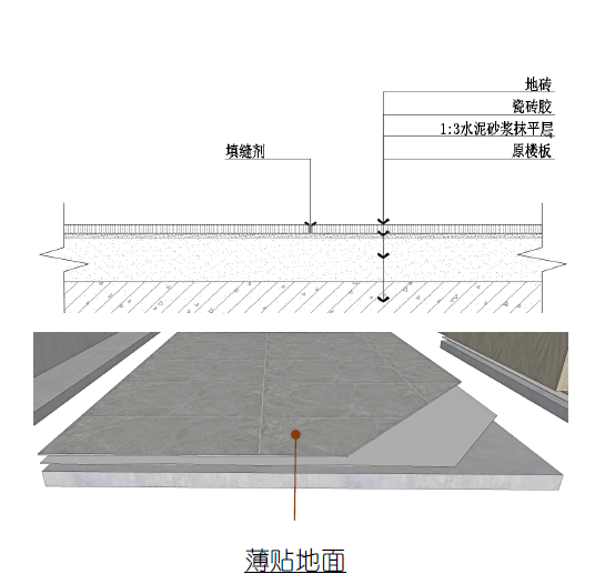 装配式地坪采用5MM瓷砖胶直接粘贴瓷砖的方式,全干法作业,取代传统的水泥砂浆找平,空鼓率降低,还可以大大提升施工速度。