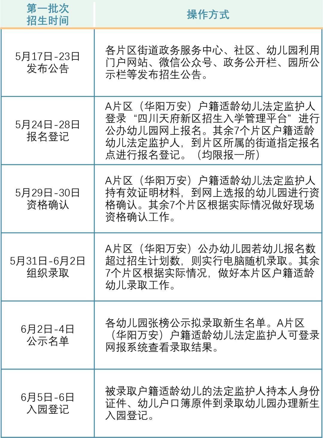 A片区(华阳万安)户籍适龄幼儿法定监护人持本人身份证和幼儿户口簿的原件、复印件(需提供户口簿首页、监护人页、幼儿页),到网上选报的幼儿园进行资格确认,并现场签定《诚信承诺书》。其余7个片区的幼儿园根据实际情况,做好现场资格确认工作。各幼儿园当场告知家长资格确认结果。