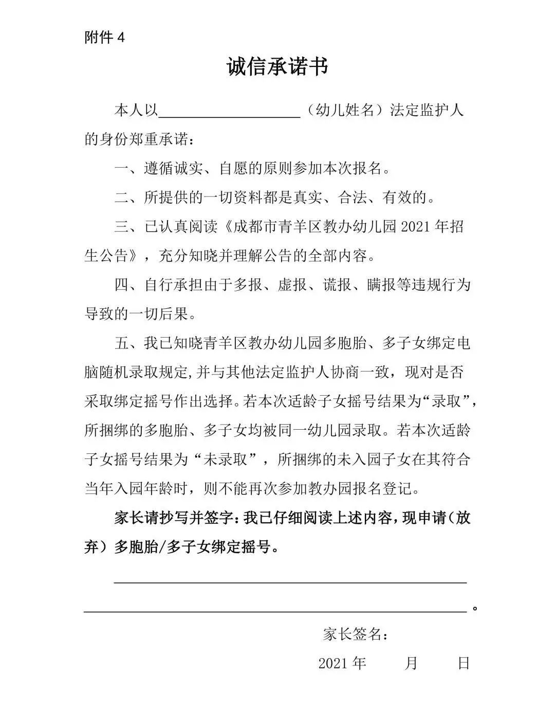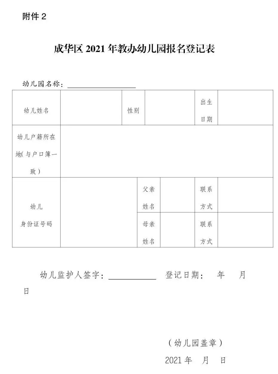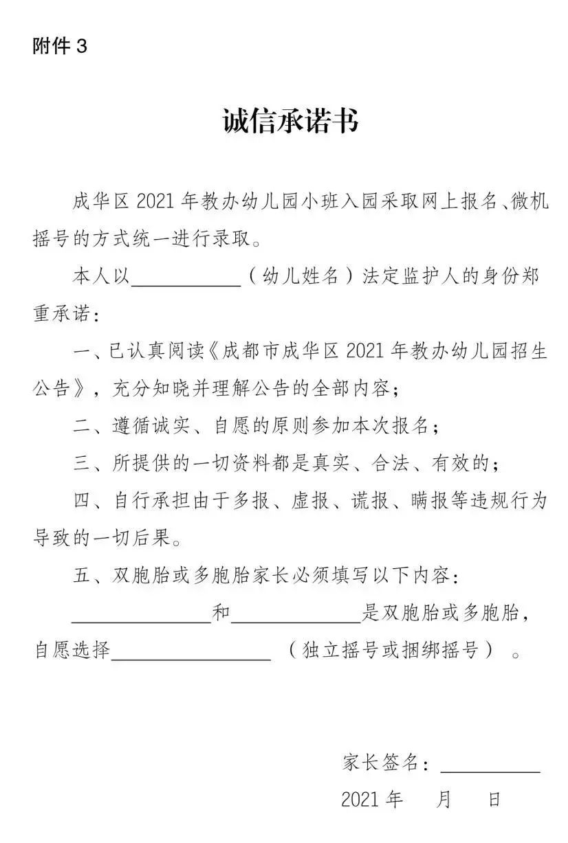(3)《成华区2021年教办幼儿园报名登记表》(附件2)和《诚信承诺书》(附件3)(家长自行下载打印);
