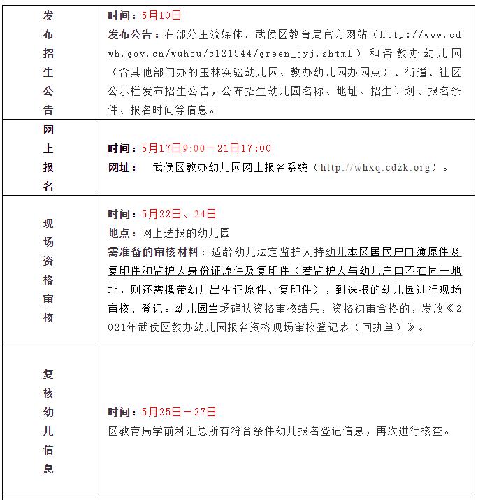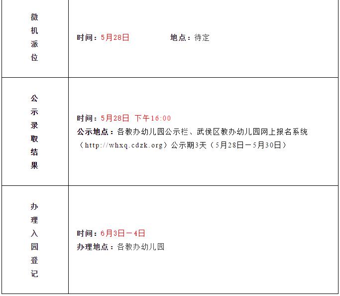 (六)5月28日16:00公布录取结果。武侯区教育局官方网站、“武侯教育”微信公众号、教办幼儿园网上报名系统及各幼儿园公示录取结果。公示期3天(5月28日—5月30日)