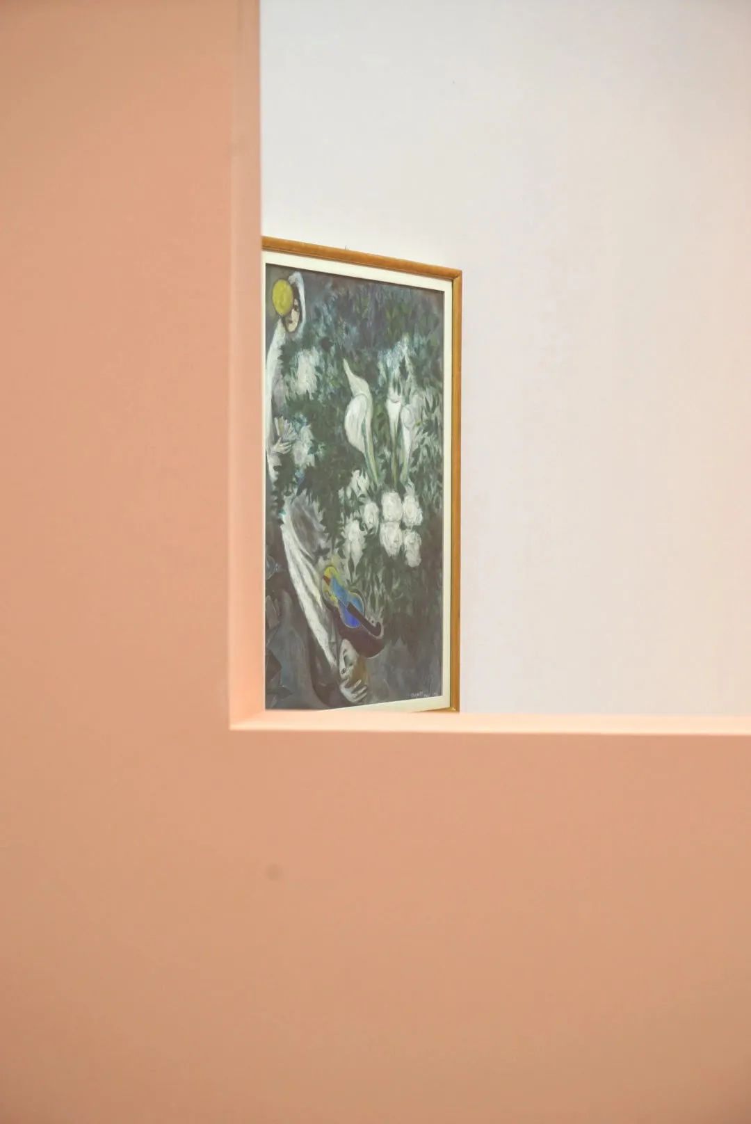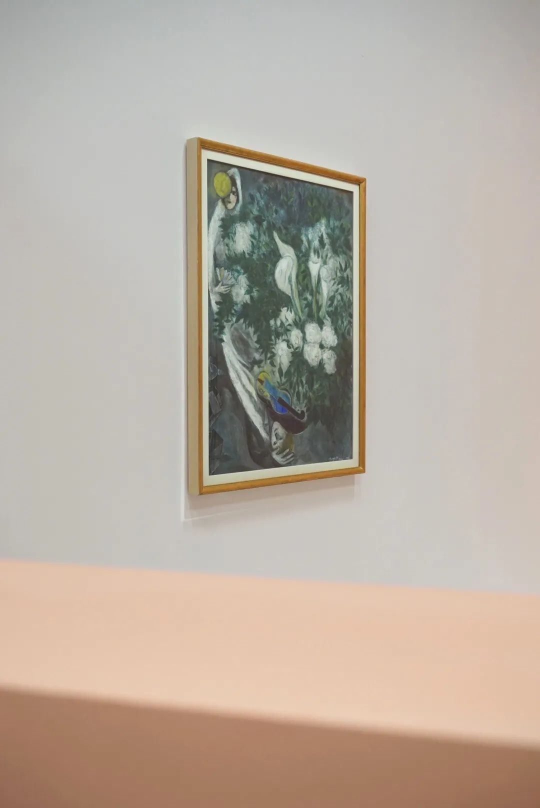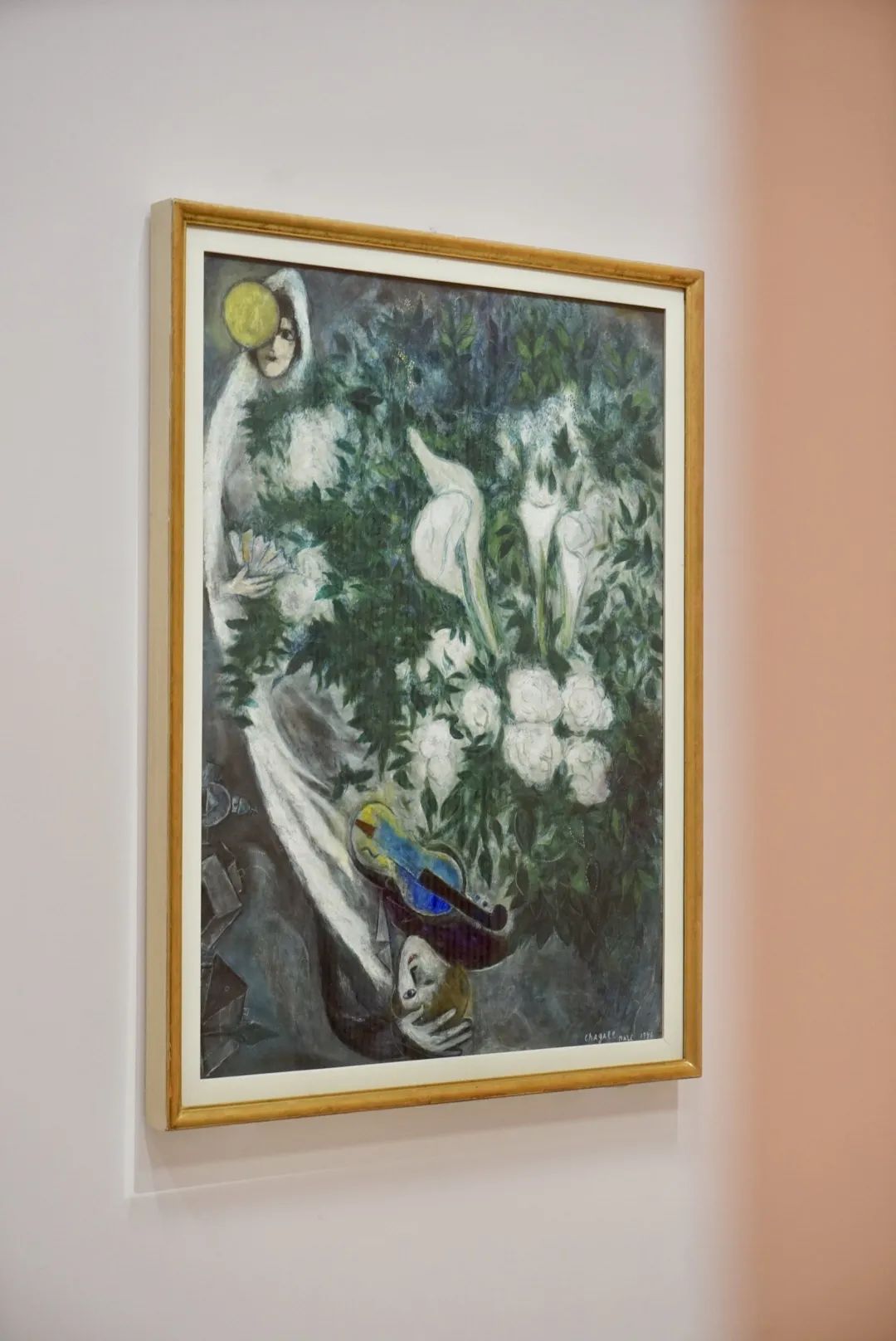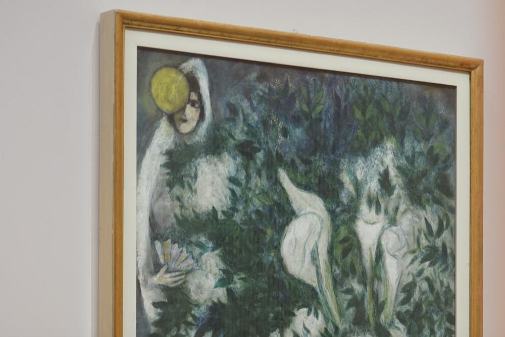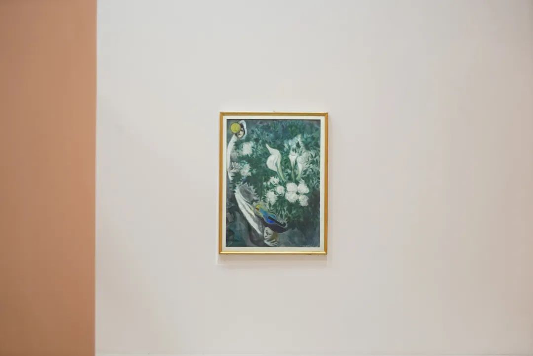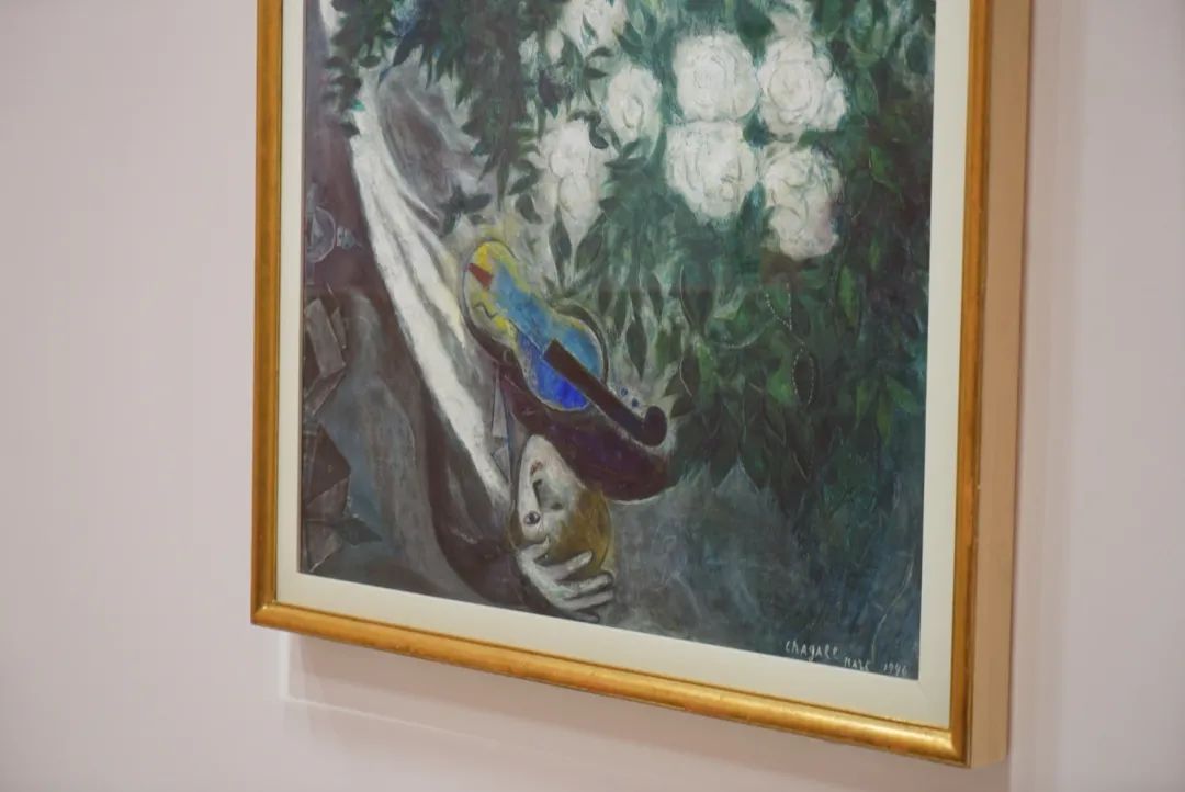 在他们的面前,婚礼的花朵正在盛放,好似属于人间的幸福与无尽喜悦尚未被完整经历;而在他们的身后,家园、屋顶、村庄在墨黑的世界里几不可见,仿佛这俗世的幸福已与他们无关。在麓湖·A4美术馆的“马克·夏加尔”展展厅里,我第一次看到了这件《月亮花束或白色海芋》,和夏加尔另外的154件作品一起,仍显得如此特别。