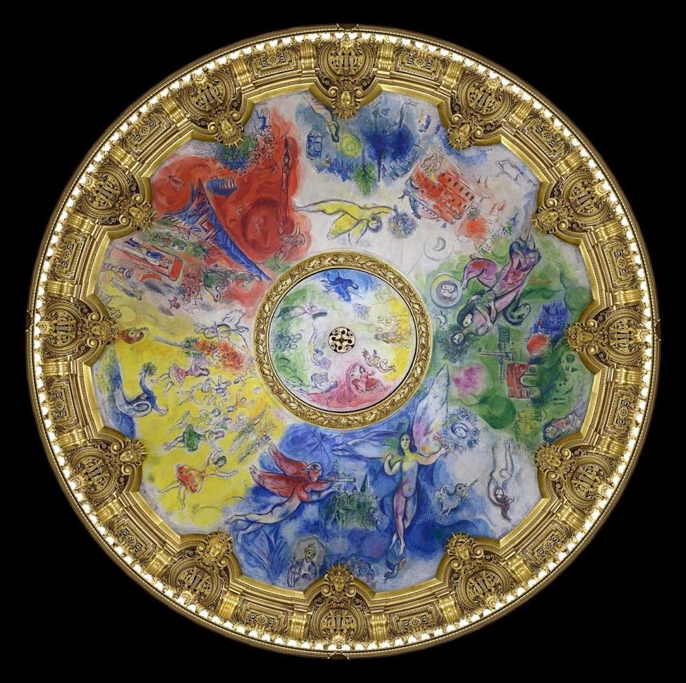 1964年,夏加尔为巴黎歌剧院创作的巨幅彩绘天花板,他在上面描绘了莫扎特、瓦格纳等人歌剧中的场景。图源/网络
