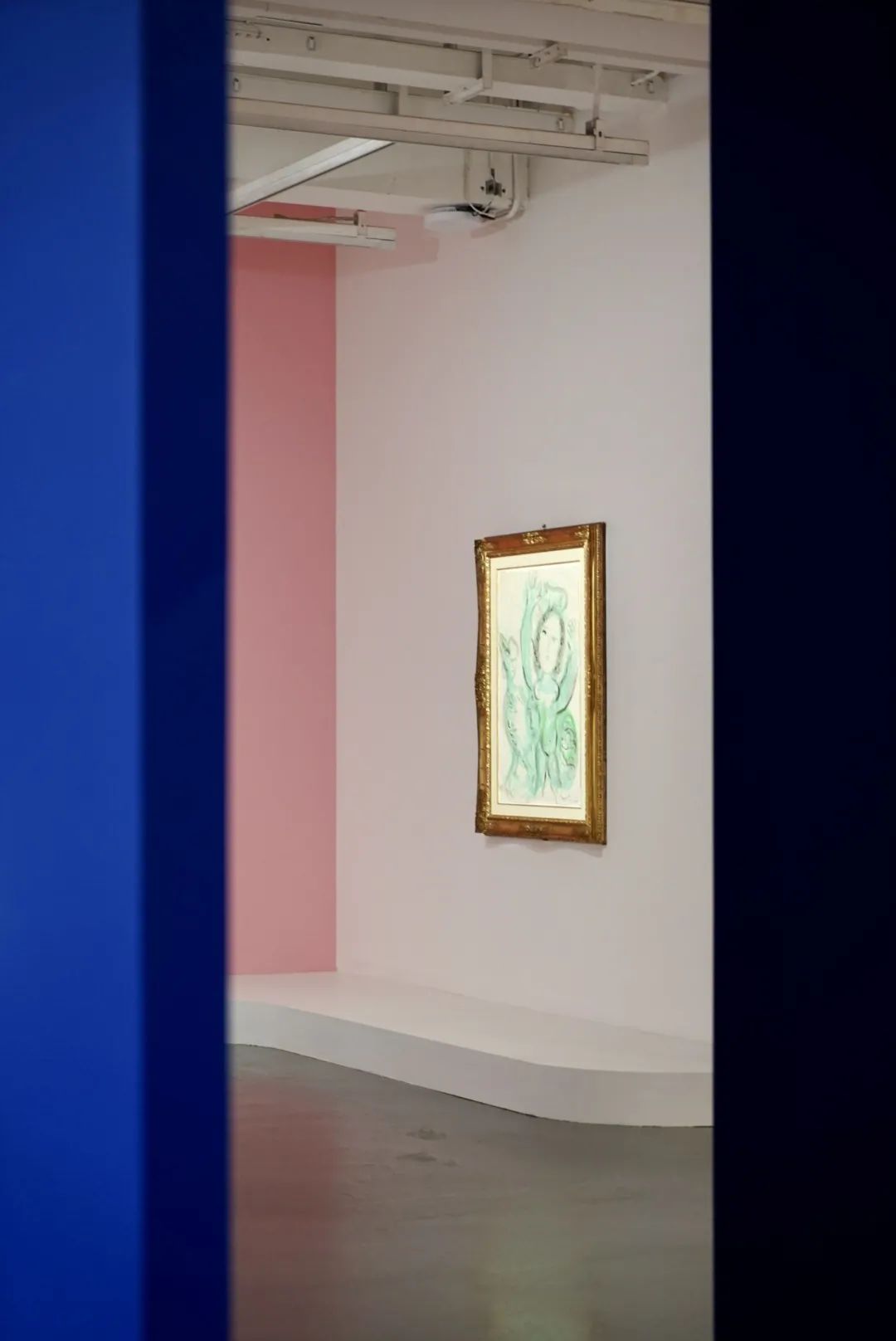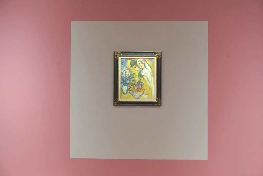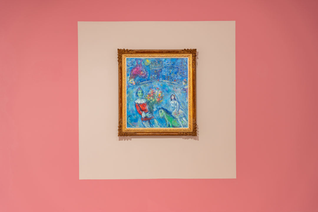 麓湖·A4美术馆的“马克·夏加尔”展,共展出了马克·夏加尔在横跨60年里创作的155件作品,囊括油画、水彩画、水粉画、坦培拉、蚀刻版画等多种艺术形式。仿佛是为了衬托夏加尔里的多彩与丰饶,此次麓湖·A4美术馆的展厅也以从夏加尔画作里提取的颜色作为分隔,从而区分出不同的主题板块。不论是顺时针、逆时针的观览,还是转角处的一个回头,都能看到展厅里的色彩与艺术家画作的亲密呼应。