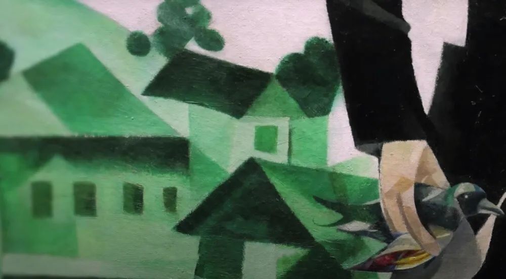 而它们似乎全然不打算按照它们本来的颜色来表现。牛可能是蓝色的、马儿是绿色的、人是红色的、公鸡是紫罗兰色的……整个画面被着以缤纷色彩,仿佛世间所有的颜色都为他所用。