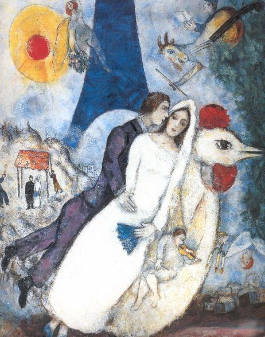 总是随着“夏加尔”的名字出现在搜索引擎页面里的《黄色背景上的恋人》里,恋人们像连体婴儿般紧紧拥抱,婚礼的繁花与果实永远新鲜、甘甜,整个画面如同浸满了蜂蜜。