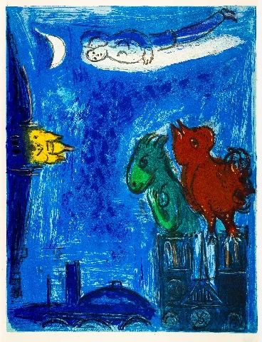 任何一个耽于梦想的人,恐怕都会沉迷于夏加尔的世界:人、动物、花朵、马戏团的小丑、小提琴手、长着翅膀的小提琴、仙女、恶魔、宗教的象征物、无数的屋顶,恋人们相拥飞翔于天空中,俄罗斯民间传说里的形象与个人的生活、梦境混融一体,织造出同一个穹顶。