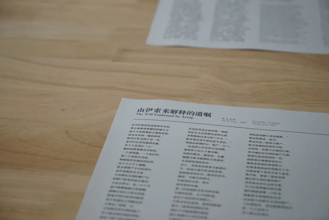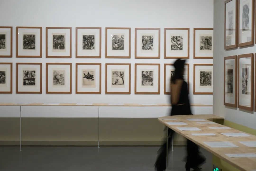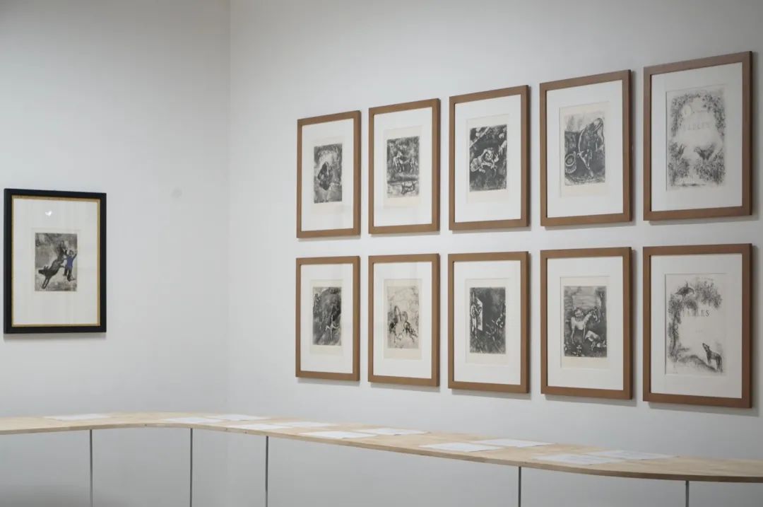 加上2页卷首,这套代表着夏加尔版画杰出成就的《寓言集》蚀刻版画,包含了整整105幅版画。为了让插图文本得到更好的理解,同时呈现更完整的观览体验,美术馆团队还搜集了所有寓言故事的中英双语文本,对照到展厅的每幅画作。对蚀刻版画感兴趣的观众,或者艺术系的师生们,一定不能错过这个难得的机会。